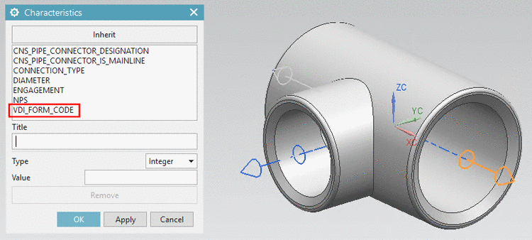 ifugnx.cfgauf ein NX-Merkmal gemappt werden (hier im Beispiel "VDI_FORM_CODE"), einmal unterConnPointCharacteristics(hasConnPointPipingClass)[hier wird der Wert den einzelnen Ports als Charakteristikum zugewiesen] und einmal unterCadPipingAttributes[hier deklarierte Merkmale kommen in der Tabelle an].Damit das Merkmal in der Routing Reuse Search zur Verfügung steht, muss es in