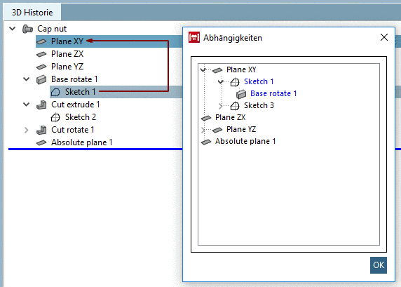 Das Dialogfenster Abhängigkeiten kann auf jedem Punkt der 3D Historie aufgerufen werden.