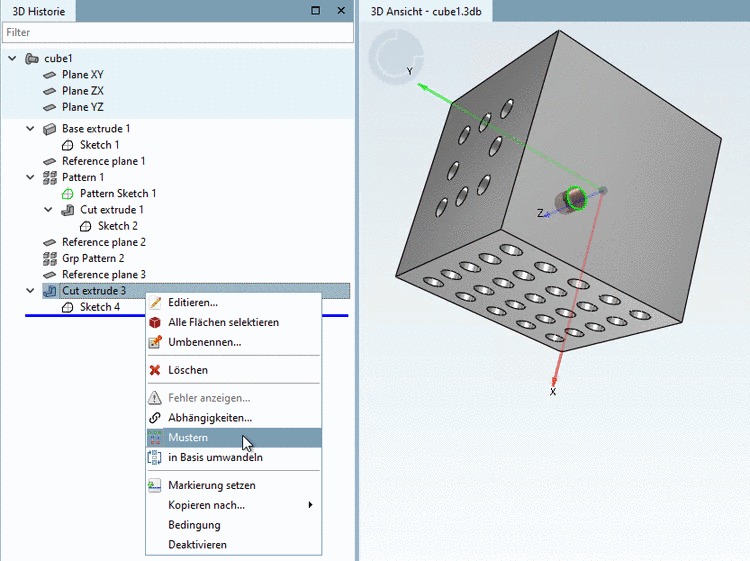 Bei mittels Wizard erzeugten Mustern (Grp Pattern) rufen Sie mittels Kontextmenübefehl Editieren... den Wizard erneut auf. Manuell erzeugte Muster editieren Sie mittels Editieren... auf der Ebene Pattern Sketch.