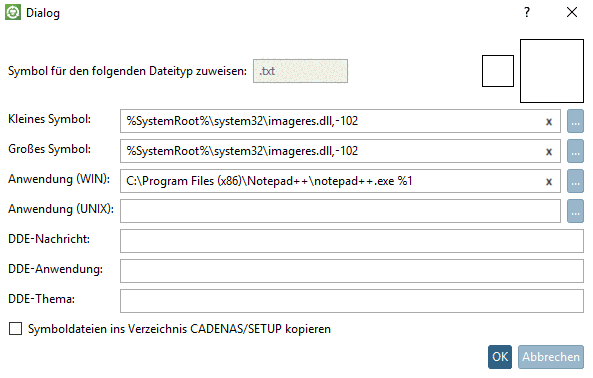 Großes Symbol bzw. Kleines Symbol: Verzeichnispfad, in dem das jeweilige Symbol für diesen Dateityp hinterlegt ist.