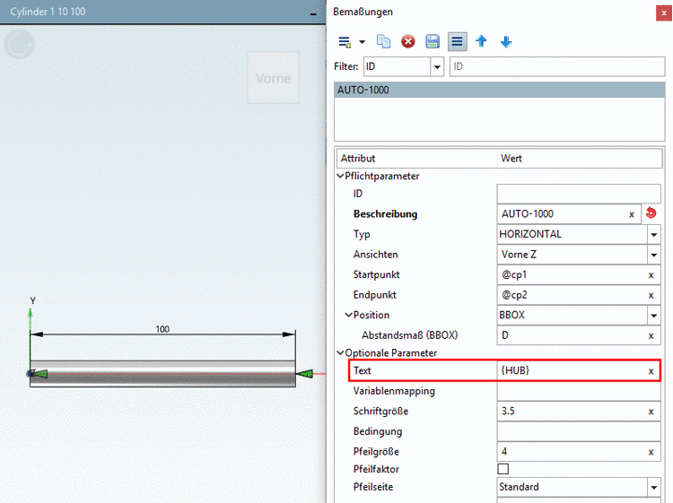 Optional können Sie eine automatische Bemaßung setzen. Die angezeigte Maßzahl soll sich beim Einschalten der verkürzten Ansicht nicht ändern! Deswegen ist bei Text keine IF-Bedingung verwendet, auch nicht {AUTOMATIC}, sondern '{HUB}'.