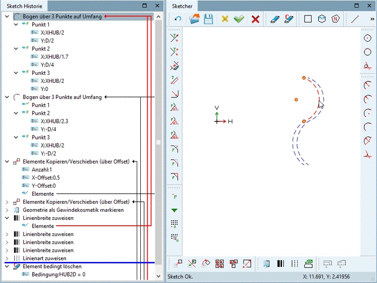 Um die Verkürzte Ansicht zu visualisieren, fügen Sie auf derselben Ebene wie der für den Hauptsketch verwendeten (hier im Beispiel Plane XY) einen Sketch mit einer "kosmetischen Zeichnung" ein.