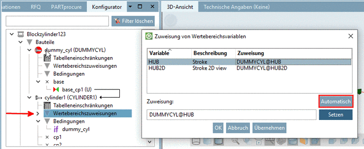 An einem Beispiel sollen alle Schritte, die zur Darstellung einer alternativen verkürzten 2D-Ansicht benötigt werden, detailliert erläutert werden. Um den Effekt zu verdeutlichen, ist ein stark vereinfachter Blockzylinder gewählt. Die Zylinderlänge ('HUB') soll alternativ verkürzt dargestellt werden. Dazu werden zwei weitere Variablen als Steuervariable (hier im Beispiel 'HUB2D') und als Defaultwert für Steuervariable (hier im Beispiel 'XHUB') benötigt. Nach Aktivierung der Option Zeichnungsansicht auf Blatt optimieren wird in der 2D-Darstellung der Wert der Variablen XHUB zur Berechnung der Zylinderlänge verwendet.
