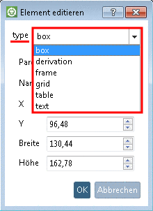 aufziehen können und das Dialogfenster Element editieren. Dort finden Sie unter