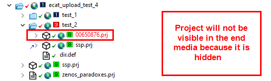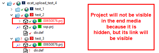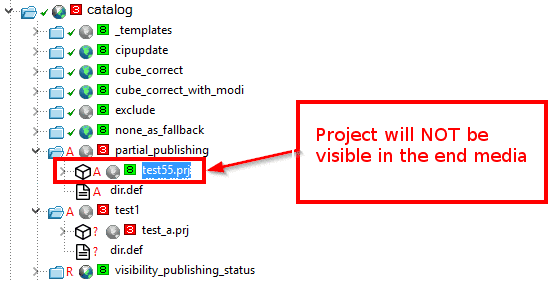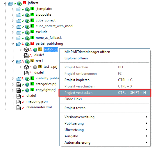 Versteckte Projekte sind in Ausgabemedien immer unsichtbar, auch wenn die Publizierungsmarkierung ( = grüner Globus ) gesetzt ist.
