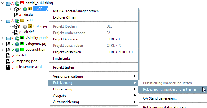 • Kontextmenübefehl Publizierung -> Publizierungsmarkierung entfernen