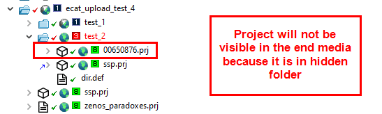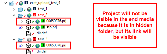 Original-Projekt und Linkprojekt nicht sichtbar (obwohl nicht versteckt = schwarze Schrift), da deren übergeordnete Verzeichnisse versteckt sind (rote Schrift)