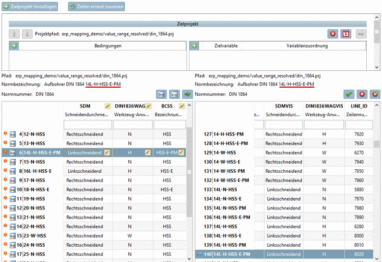 Wenn Sie nun in der linken Tabelle die Werte von Wertebereichsvariablen ändern, wird automatisch in der rechten Tabelle die korrekte Zeile angezeigt.