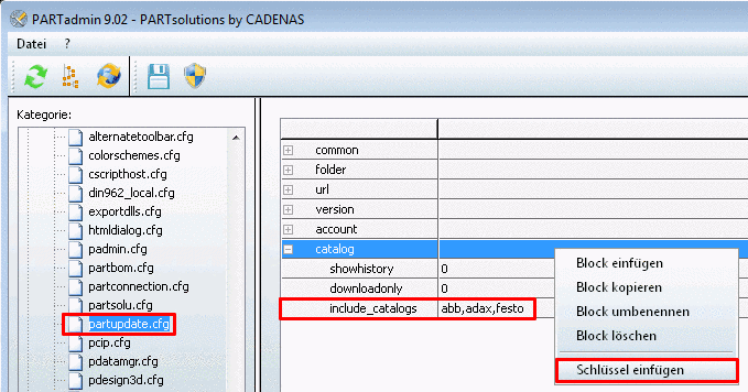 Setzen Sie in PARTadmin -> Kategorie -> Konfigurationsdateien -> $CADENAS_DEFAULTUSER -> partupdate.cfg -> Block catalog den Schlüssel include_catalogs.