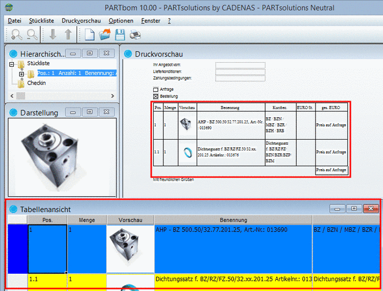 -> In der Druckvorschau (das eigentliche Formular) sehen Sie nun das übergebene Teil als Posten, in der Tabellenansicht die Daten.