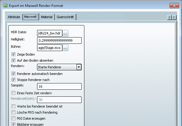Wenn unter Format die Auswahl Maxwell Render getroffen wird, öffnet sich nach Bestätigen der Einstellungen mittels die Dialogseite Export im Maxwell Render-Format.