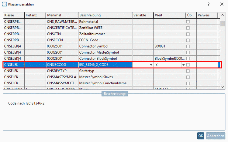 entsprechenden Wert unter Klasse CNSELEK -> Merkmal CNSIECCOD mit der Beschreibung IEC_81346_2_CODE.
