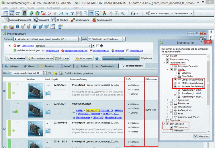 Sie können im Dialogfenster Eigenschaften beliebige Topologiewerte aktivieren. Für alle Suchergebnisse werden diese dann unabhängig von der verwendeten Suchmethode angezeigt. Im Suchergebnis will man z.B. sehen, wie viele Bohrungen Teile haben, weil man das in der Vorschau evtl. nicht erkennen kann oder man möchte beispielsweise standardmäßig die Längste Ausdehnung, Mittlere Ausdehnung und Kürzeste Ausdehnung sehen.
