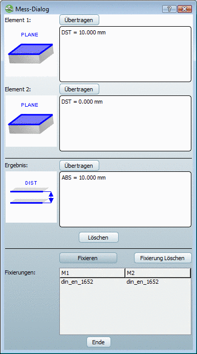 Der Mess-Dialog gliedert sich in die Felder Element 1, Element 2 und Ergebnis und Fixierungen.