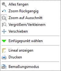 Die Befehle Alles fangen, Zoom rückgängig (=Alles fangen), Zoom auf Ausschnitt (Ansicht auf einen rechteckigen Ausschnitt vergrößern), Vergrößern/Verkleinern und Verschieben sind unter Abschnitt 3.1.19.6.2.1, „Übersicht“ in PARTsolutions - Handbuch für Anwender erläutert.
