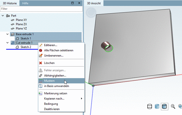 Der Aufruf erfolgt auf Base extrude bzw. Cut extrude per Kontextmenübefehl Mustern.