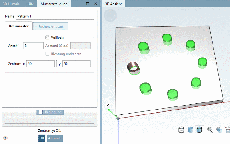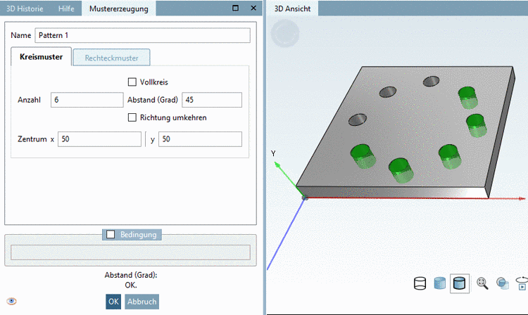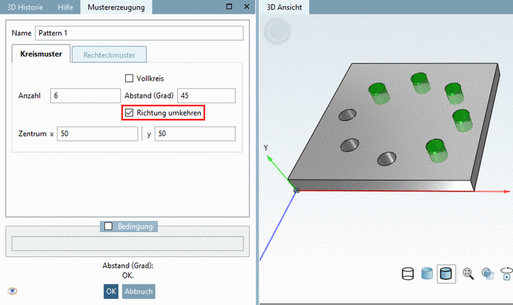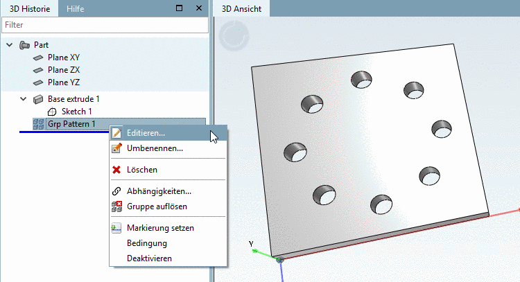 -> Das Kreismuster wird in der 3D Historie unter Grp Pattern angezeigt.