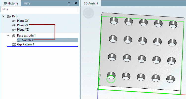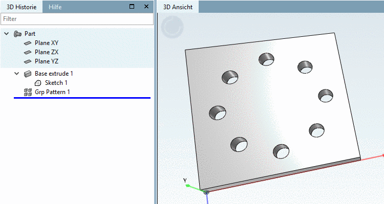-> Das Rechteckmuster wird in der 3D Historie unter Grp Pattern angezeigt.