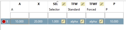 Beim Laden der Tabelle werden die Startwerte angezeigt. Der Startwert ist repräsentiert durch den ersten in der Formel gesetzten Parameter. Beim Selektor ist dies 1, bei TFW (TMA) und TFWF (TMAF) aufgrund der gesetzten Bedingung der Wert "alpha".