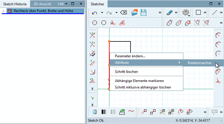 -> Die zunächst rot markierte Linie/Kante erscheint daraufhin als Punkt-Strich-Achse und in der Sketch Historie wird neben dem Feature, welches die Rotationsachse enthält, ein entsprechendes Icon angezeigt.