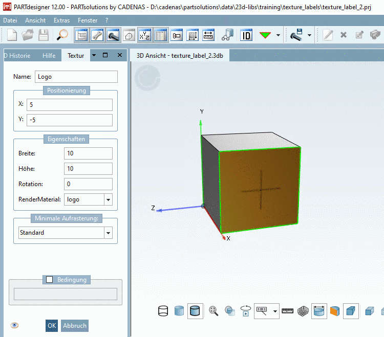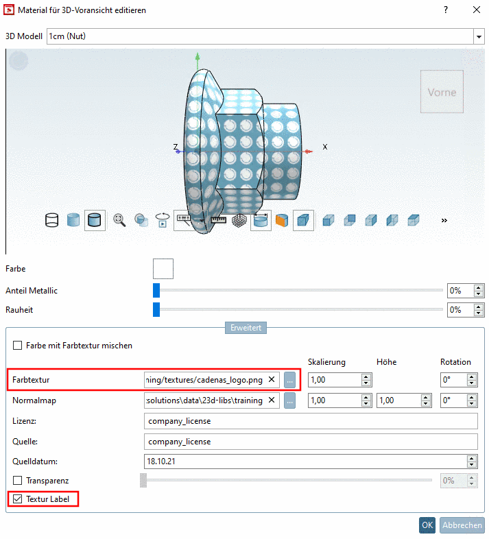 Wählen Sie unter Farbtextur den Bildpfad zum Bild, das als Label verwendet werden soll und aktivieren Sie das Auswahlkästchen Textur-Label.