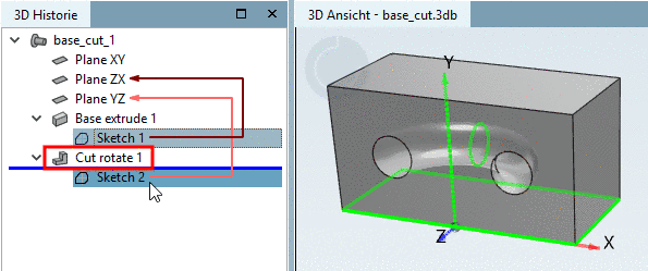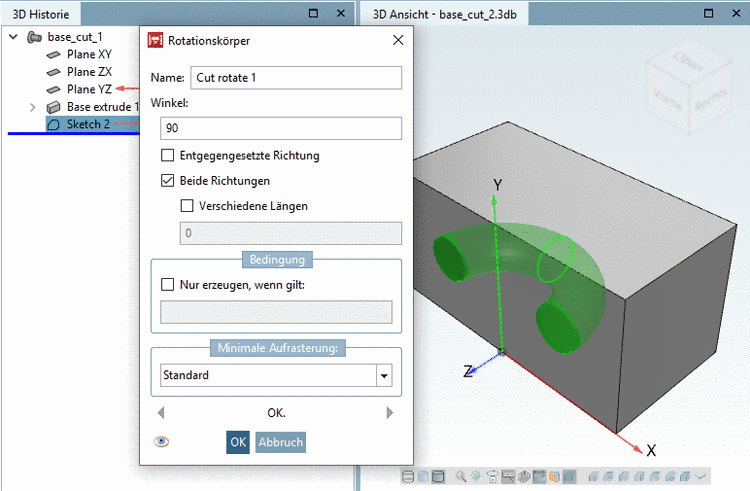 Wählen Sie in der 3D Historie unter Sketch 2 den Kontextmenübefehl Schnitt -> Rotieren....