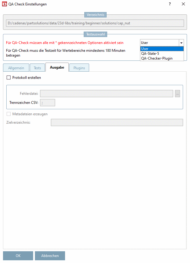 Protokoll erstellen: Das Testlauf-Protokoll kann entweder alle durchlaufenen (Logdatei) oder nur die fehlerhaften Projektzeilen (Fehlerdatei) aufzeichnen. Aktivieren Sie dazu das Auswahlkästchen Protokoll erstellen. --> Tragen Sie im Feld Fehlerdatei den gewünschten Protokolldatei-Speicherort inkl. der Endung (z.B. *.csv) ein.