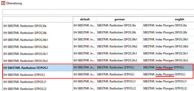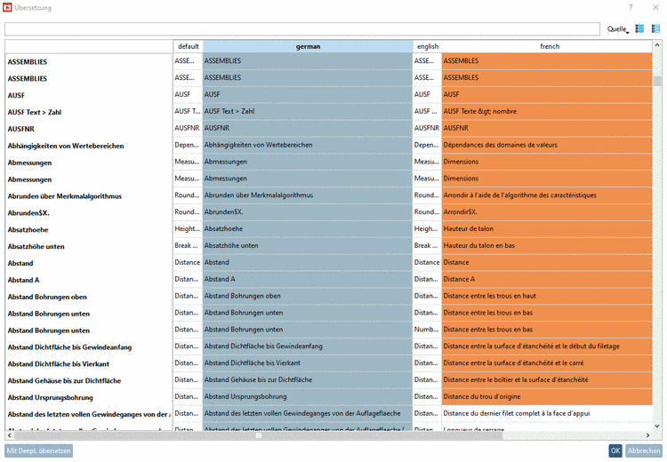 Ganz rechts wird die Quelle des jeweiligen Begriffs angezeigt wie z.B. Normbezeichnung, Stücklistenbezeichnung, Projektwert, etc.