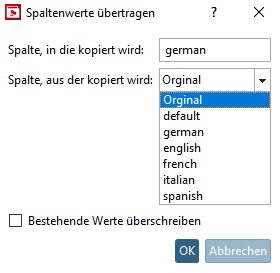 Im gleichnamigen Dialogfenster wählen Sie die Quellsprache (Spalte, aus der kopiert wird), sowie die Zielsprache (Spalte, in die kopiert wird [Default ist die Sprache der selektierten Spalte]) aus.