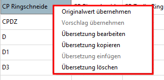Bei den Ausdrücken in ausgegrauter Schrift handelt es sich um bereits angelegte/vorhandene Übersetzungen, die innerhalb anderer Verzeichnisse verwendet werden und die PARTproject sich "gemerkt" hat. Sie sind lediglich Vorschläge und können entweder überschrieben oder per Kontextmenübefehl Vorschlag übernehmen (für ein einzelnes Feld) bzw. Vorschläge übernehmen (für eine ganze Spalte) fest eingetragen werden.