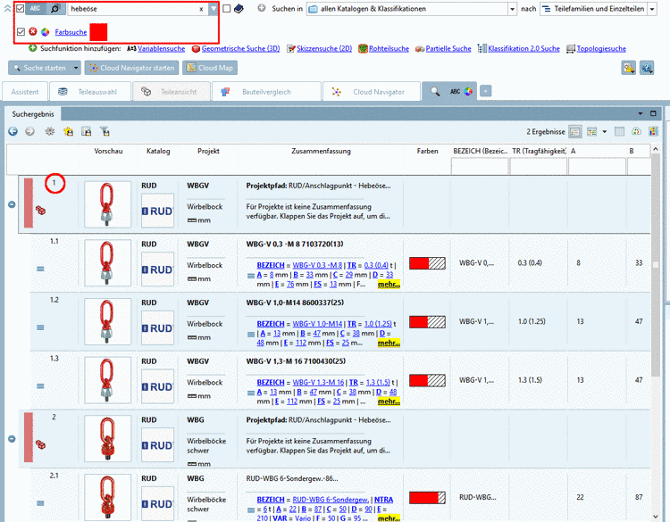 -> Je weiter spezifiziert wird, um so mehr Variablenfilter (bei Schrauben z.B. Gewindenenndurchmesser und Länge, etc.) werden angezeigt.