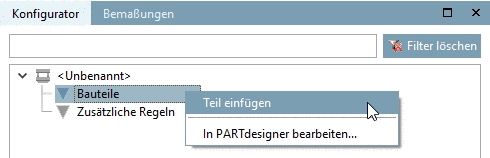 Um einer Konfiguration Bauteile zuzufügen, rufen Sie über dem Element Bauteile den Kontextmenübefehl Teil einfügen auf.