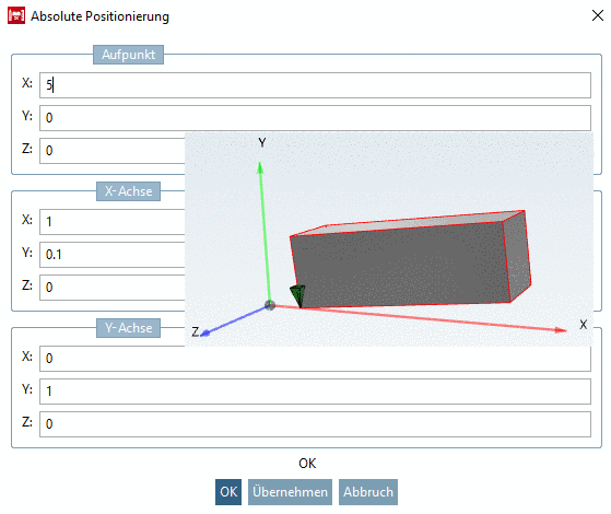 Im Beispiel oben wurde das Bauteil in Richtung der X-Achse um 5 Einheiten nach rechts verschoben und in der Ebene X-Y (Z=0) mittels Vektor (1; 0,1) nach oben geschwenkt. In Bezug auf die Orientierung der Y-Achse des Bauteils wurde keine Veränderung vorgenommen.