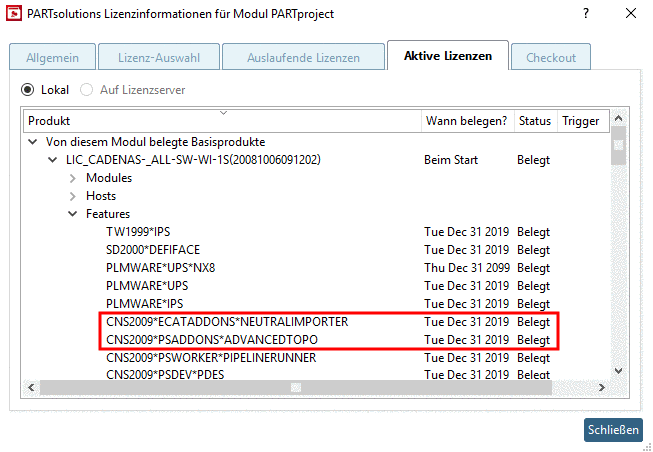 Aktive Lizenzen sehen Sie, wenn Sie in der Anwendung F9 klicken bzw. im Hilfe-Menü auf den Menüpunkt Lizenzen. Öffnen Sie im Dialogfenster den Unterpunkt Features.