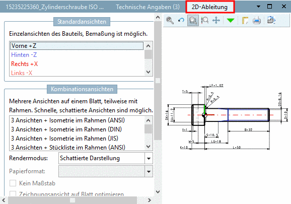 Die Standard 2D-Ableitungen können im Nachhinein modifiziert werden. Im PARTdataManager, im Dockingfenster 2D-Ableitung, stehen Ihnen diese dann in der Spalte Ansicht unter einem eigenen Namen zur Verfügung.