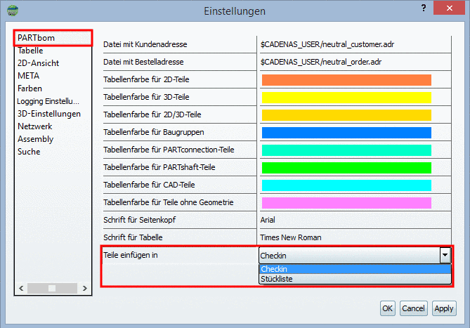 Sie können einstellen ob Teile und Baugruppen unmittelbar im Ordner Stückliste abgelegt werden sollen oder zunächst im Ordner Checkin. | |