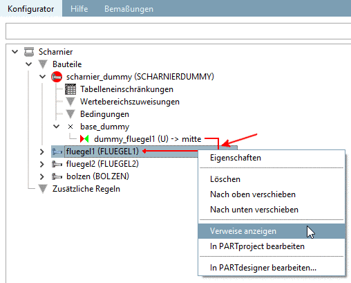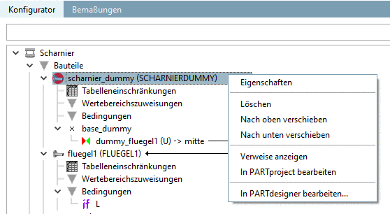 Eigenschaften, Löschen, Nach oben verschieben, Nach unten verschieben, Verweise anzeigen, In PARTproject bearbeiten, In PARTdesigner bearbeiten