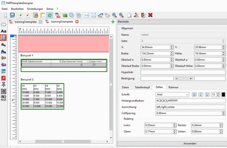 • Allgemein: Die allgemeinen Standardeinstellungen finden Sie unter Abschnitt 10.4.2, „Allgemeine Einstellungen“. Bei Tabellen gibt es die Besonderheit dass die Tabelle auf den Überlaufseiten anders definiert werden kann als auf der ersten Seite.