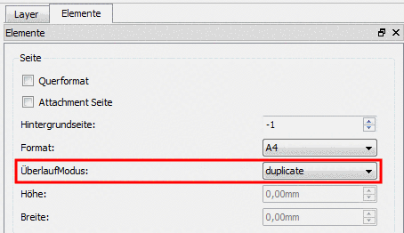 • Wenn Sie den Überlaufmodus benutzen möchten, dann muss unter Elemente -> Seite -> Überlaufmodus die Option duplicate gewählt sein!