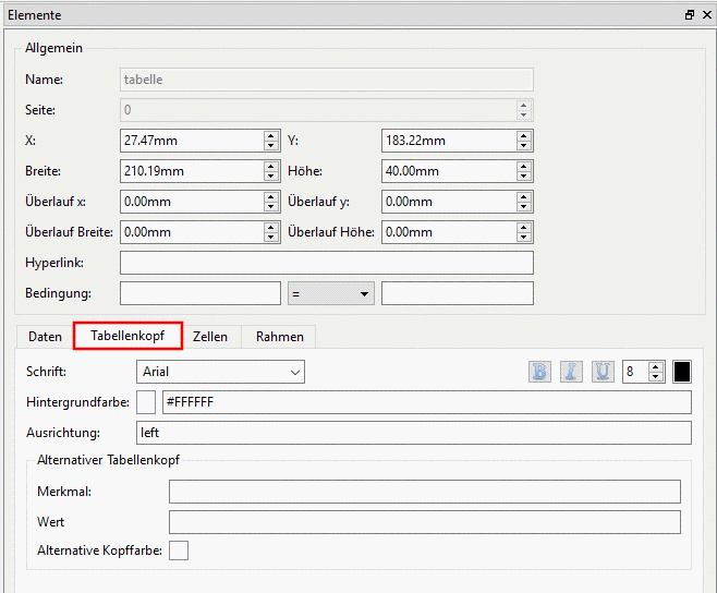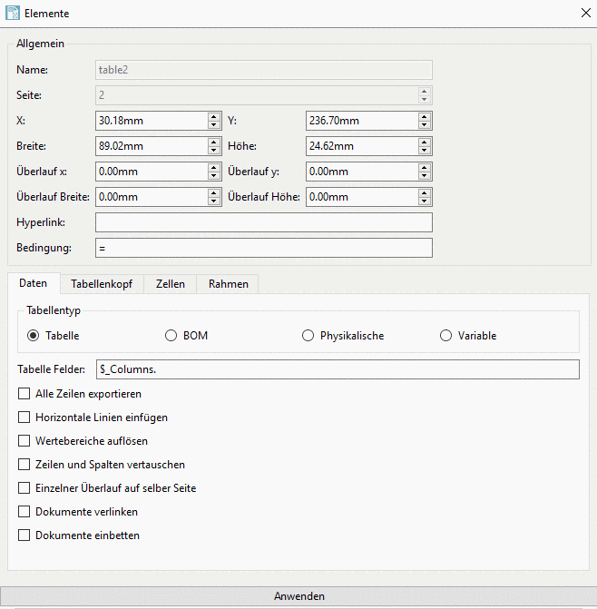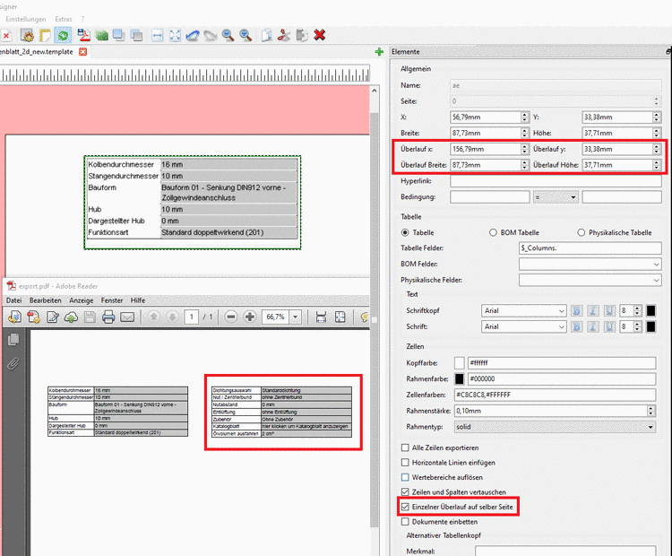 • Überlauf x / Überlauf y: Position der Tabelle im Überlaufabschnitt