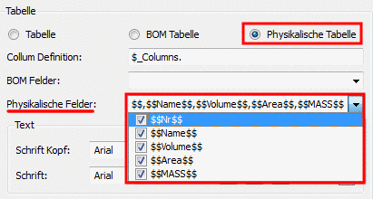 Sie können für ein Template die Optionen Tabelle, BOM, Physikalische und Variable auch zusammen verwenden (bei Bedarf auch mehrmals). Legen Sie die gewünschten Tabellen einfach nacheinander an.