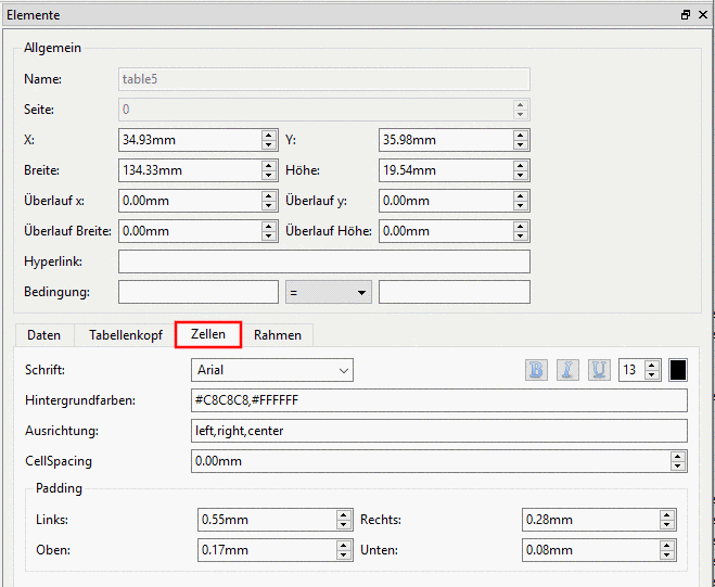 • CellSpacing: Abstand zwischen Tabellenzellen