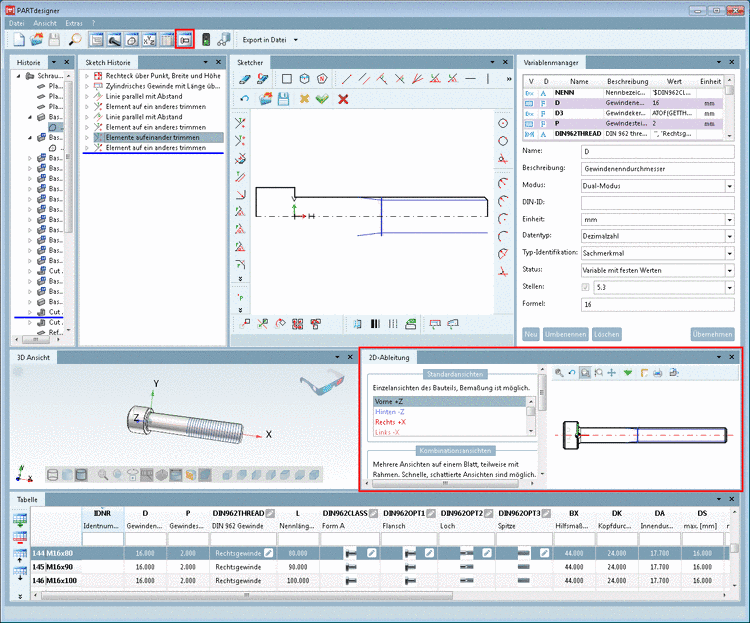 Details zur 2D-Ansicht im PARTdataManager finden Sie unter Abschnitt 12.2, „2D-Ableitung erzeugen“.