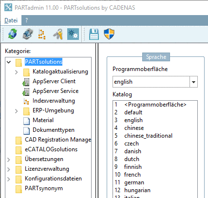 In PARTadmin muss die gewünschte Katalogsprache eingestellt sein (entweder als Default der Programmoberfläche oder explizit).
