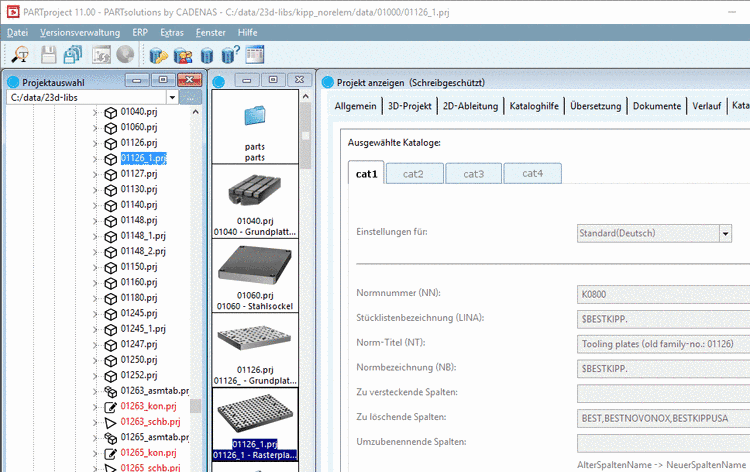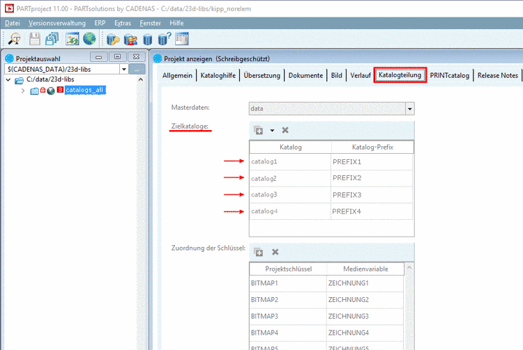 Sobald Sie links im Index ein Projekt selektieren, können Sie sich rechts nach Auswahl des entsprechenden Reiters zu jedem Katalog Details anzeigen lassen, die bei der Teilung ausgeführt werden.