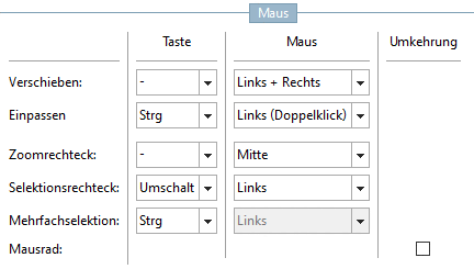 Mausrad: Mit dem Mausrad wird hinein- und hinausgezoomt. Nach unten drehen verkleinert das Bild. Wenn Sie Umkehrung aktivieren, ist es genau umgekehrt. Je nachdem wo Sie vor dem Drehen den Mauscursor positioniert haben, ändert sich die Position des Objekts.