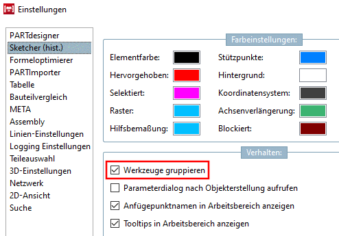 Zur besseren Übersicht sind die einzelnen Funktionsbuttons in Werkzeugleisten mit ähnlichen Funktionen zusammengefasst. In V12 wird jeweils nur der zuletzt verwendete angezeigt, die übrigen sind über eine Listenfeldfunktion (kleines schwarzes Pfeilchen) erreichbar. Im PARTdesigner unter Extras Menü -> Einstellungen... -> Sketcher (hist.) gibt es die Option Werkzeuge gruppieren, so dass Sie auch zum alten V11-Verhalten zurückkehren können (alle Buttons sind sichtbar).