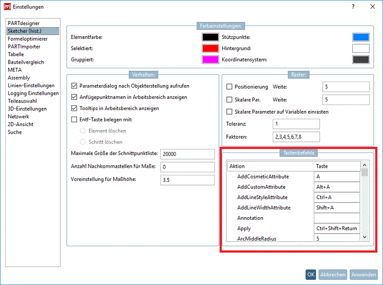Unter PARTdesigner -> Extras-Menü -> Einstellungen... -> Sketcher (hist.) -> Tastenbefehle können Sie die bereits vorhandenen Tastenbefehle anpassen.