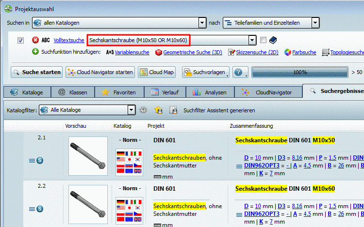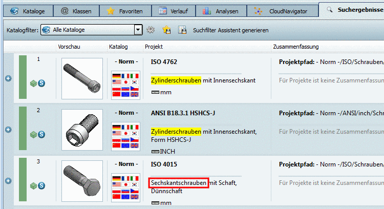 Das Ergebnis im Cloud Navigator zeigt alle gefundenen Standardteile (bei "Suchen in allen Katalogen" Hersteller-übergreifend) (zu erkennen am entsprechenden Icon
