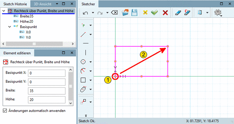 An der Cursorposition wird eine Ecke des Vielecks liegen und damit der Startwinkel bestimmt (den Sie später im Dialog Element editieren ändern können). Liegt der Punkt auf der Waagrechten, ist der Startwinkel 0°.